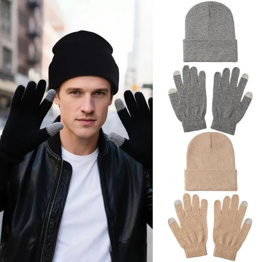 Winter Warm Knitted Hats Gloves Set Unisex Windproof Beanies Five Finger Gloves